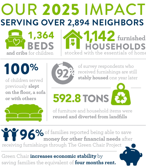 At The Green Chair Project, we believe lives change when individuals and families have the security of well-equipped homes. Thanks to your generosity-our amazing donors, partners, volunteers, and staff-we made an enormous impact in 2025. As we enter our 16th year of service, the need in our community continues to grow. With more than 105,000 people in Wake County living below the poverty line, we remain focused on securing new sources of funding, expanding community initiatives with partners, and managing with excellence. These efforts will enable us to increase our impact and serve more families who urgently need our help. We are deeply grateful to have you on this journey with us.